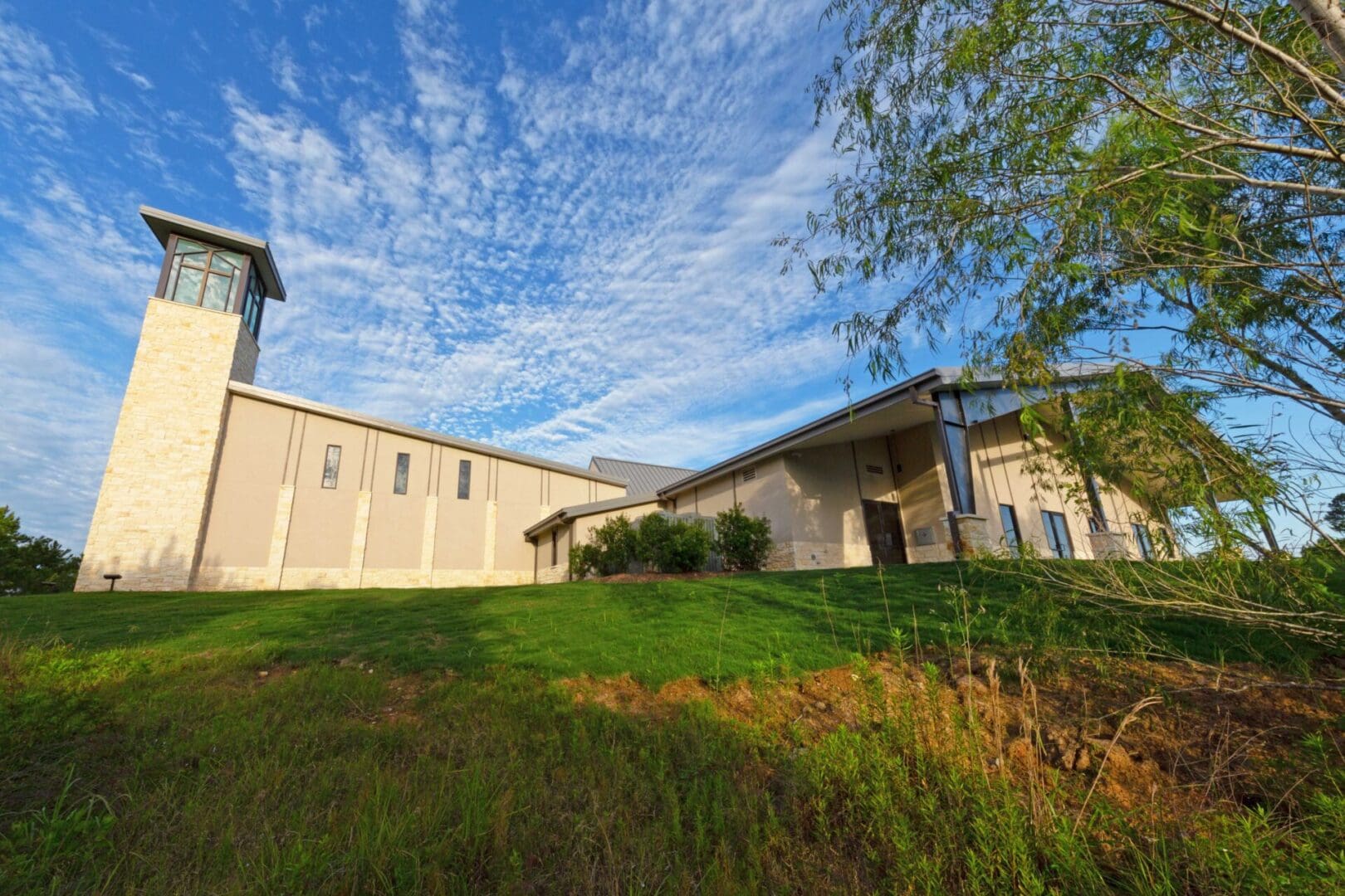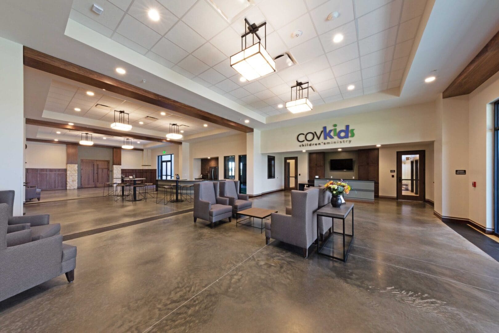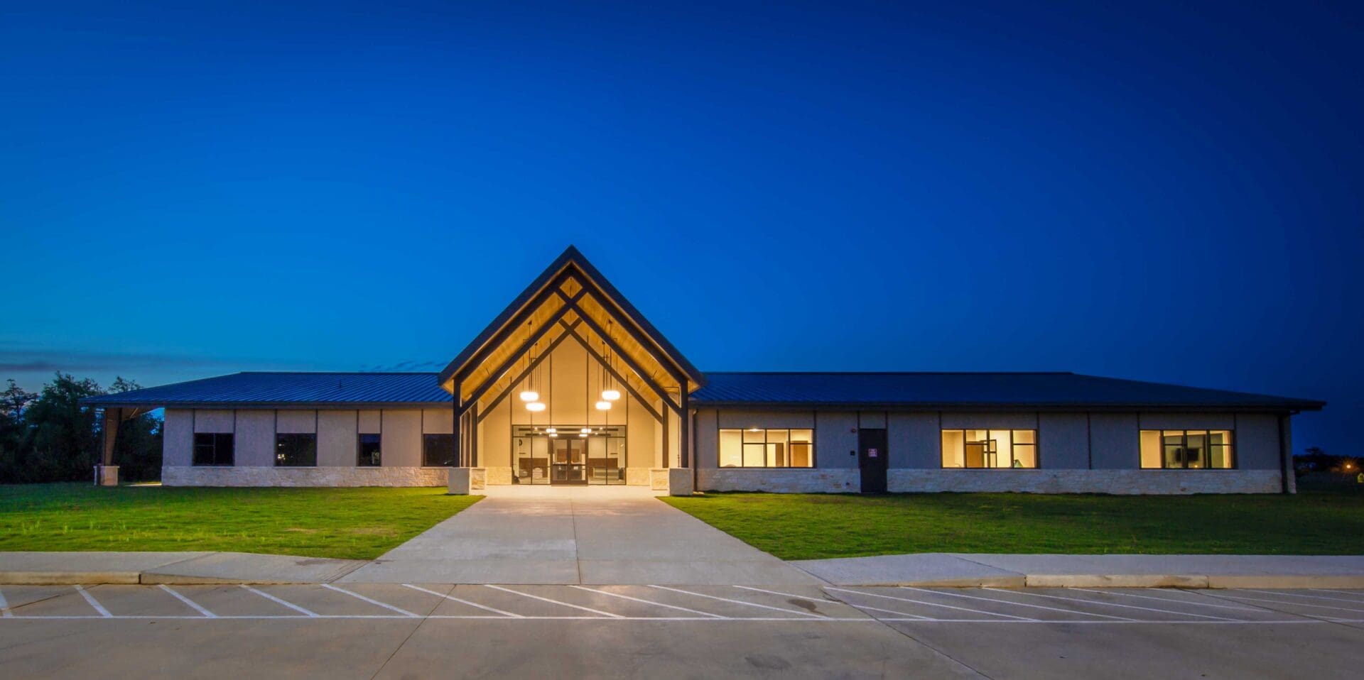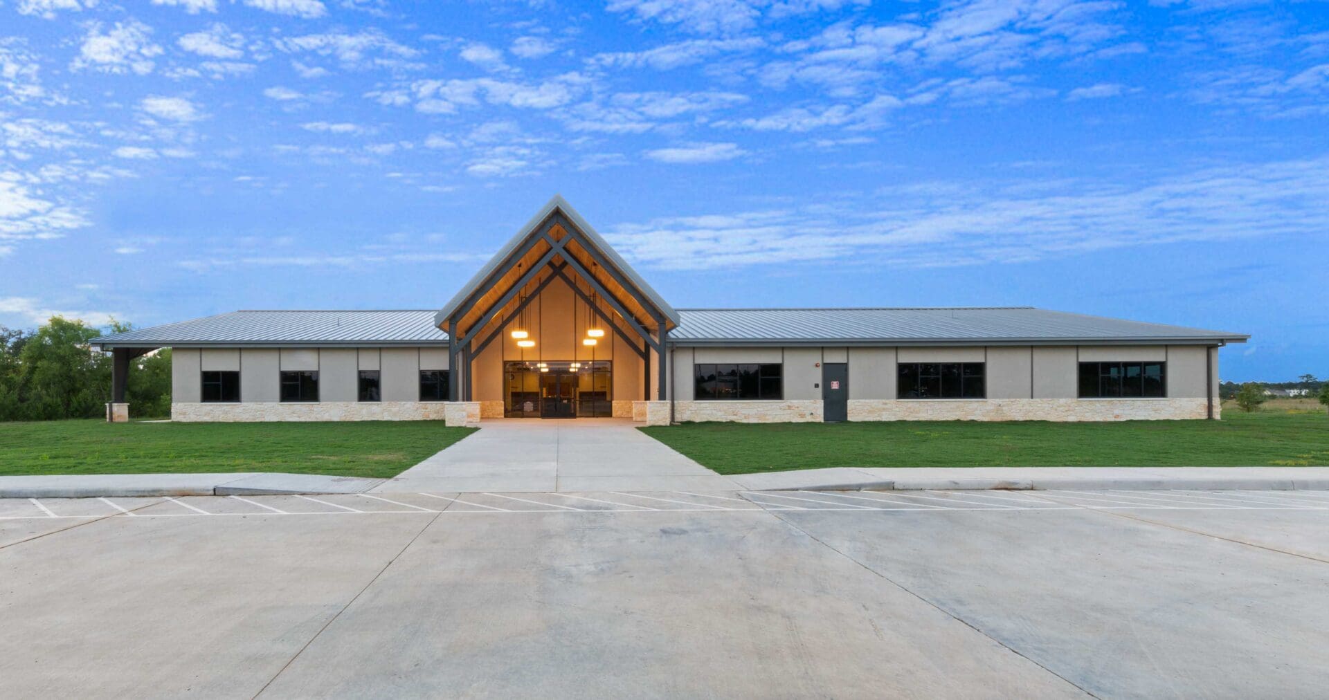The new Covenant Methodist Church is a pre-engineered metal building with a stone and stucco façade and a standing seam metal roof. The 16,000 square-foot project includes a new 700 seat sanctuary, a commons area, separate assembly and education spaces for youth and children, and administration space