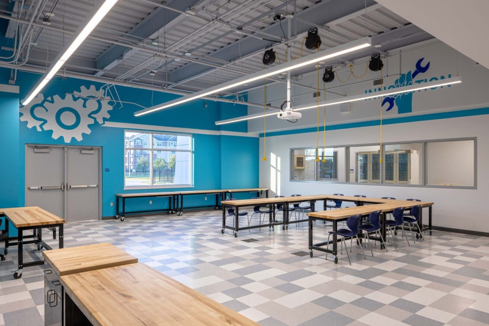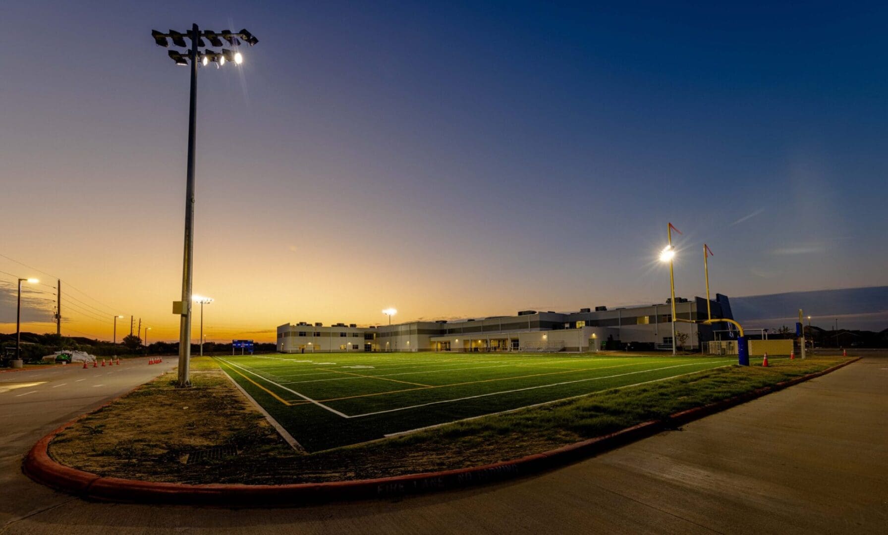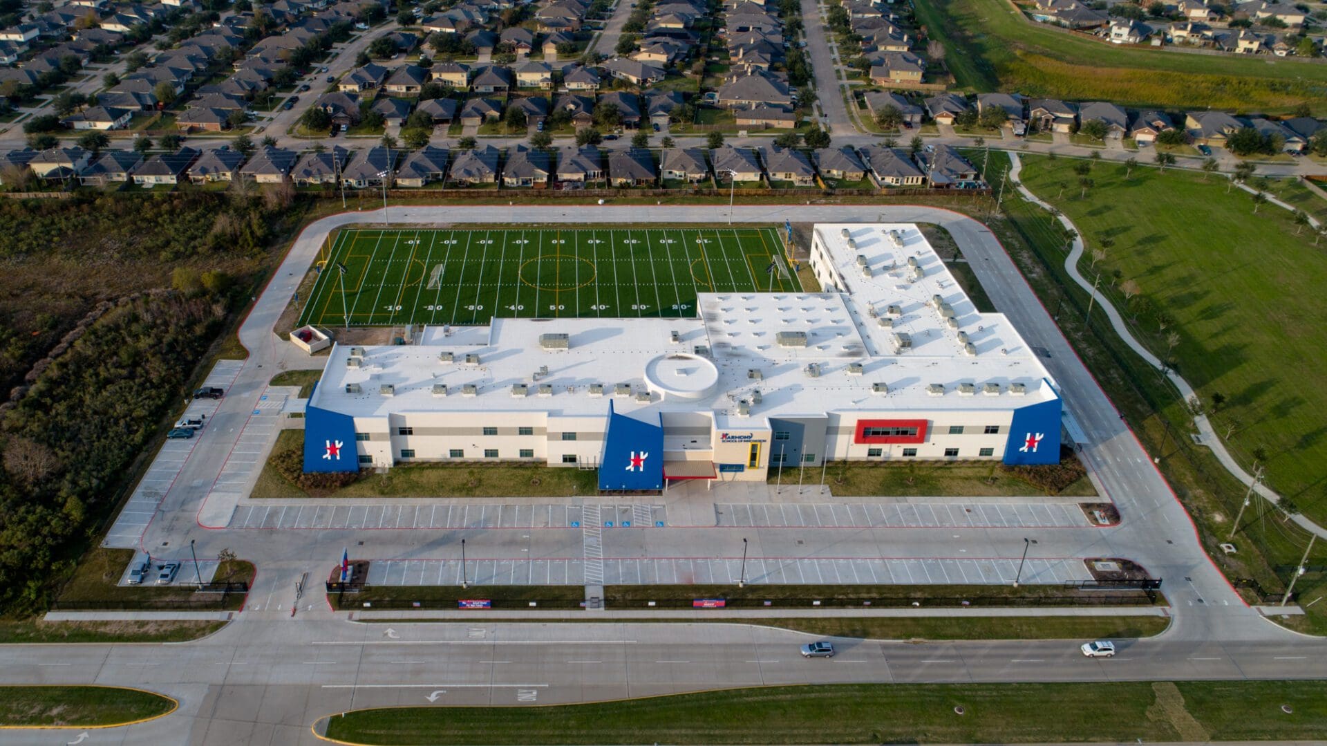 Harmony Public School’s new Harmony School of Innovation – Katy is a ground up 107,000 square-foot high school facility.  In addition to the new buildings, the project included parking lots, a high school competition ballfield, landscaping and related site improvements. The two-story structural steel building with a brick and metal panel exterior includes a gymnasium, cafeteria, kitchen, science labs, classrooms, and an administration wing.