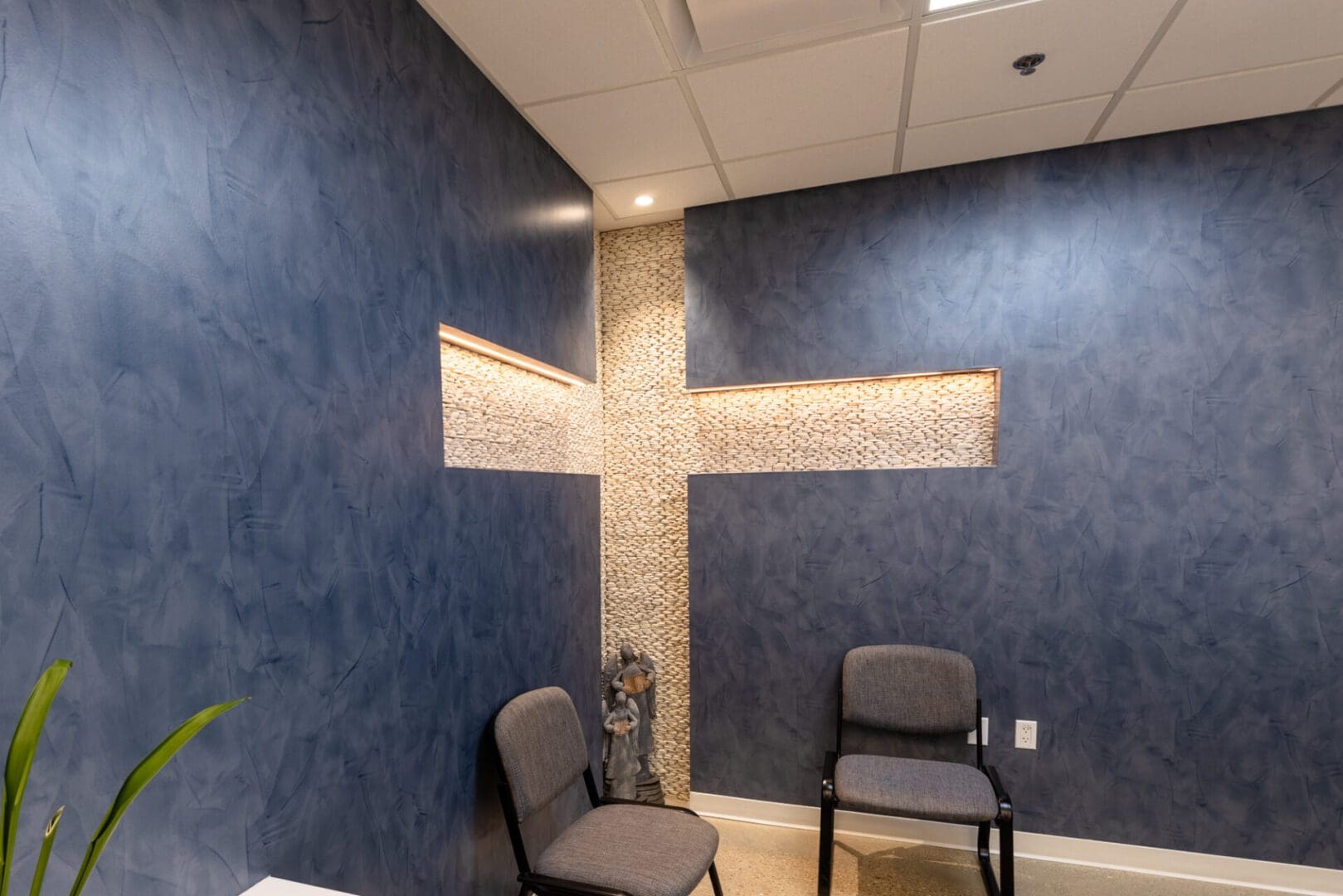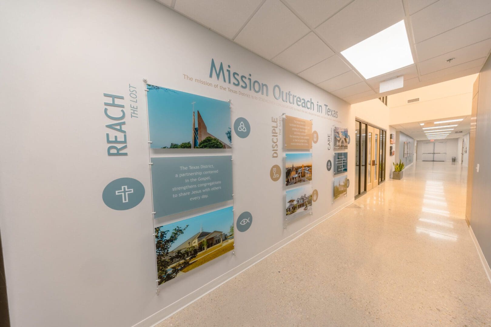 The new Texas District Mission Support Center is located in north Round Rock. The 15,000 square foot single-story structure is clad in Texas Limestone and plaster, with a standing seam metal roof and corresponding over-window canopies. The building houses three major departments within the Texas District of The Lutheran Church, and also includes a Chapel and two Large Meeting Rooms. The prominent feature of the building is a large stained glass window depicting “Christ – the Light of the World” as designed by I H S Studios of Fredericksburg.